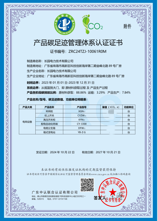 Changyuan Electric Power has released two product carbon footprint management system certification certificates.